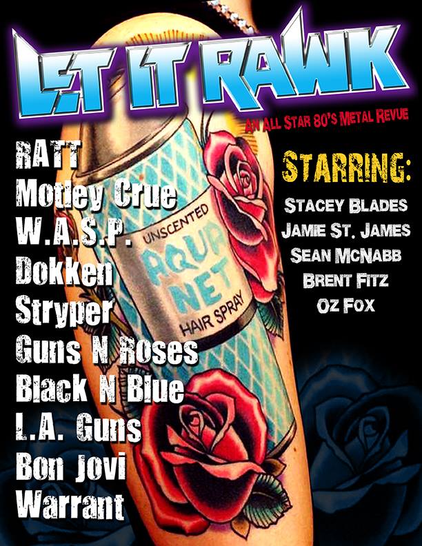 The LET IT RAWK band is the real deal. It’s fronted by Black “N Blue and ex-Warrant vocalist Jaime St. James. Guitarist Oz Fox is in the platinum-selling Christian glam rock band, Stryper. Dokken’s Sean McNabb has played bass for other Kings of The Sunset Strip including Great White and Quiet Riot. Drummer Brent Fitz from Slash And The Conspirators will be slamming the skins. Brent has also played for Vince Neil and Alice Cooper. The band will also feature floating members, such as Eddie Ojeda from Twisted Sister and Bullet Boys original drummer Jimmy D’Anda. The anchor of the band is LET IT RAWK’s creator and producer, Stacey Blades.