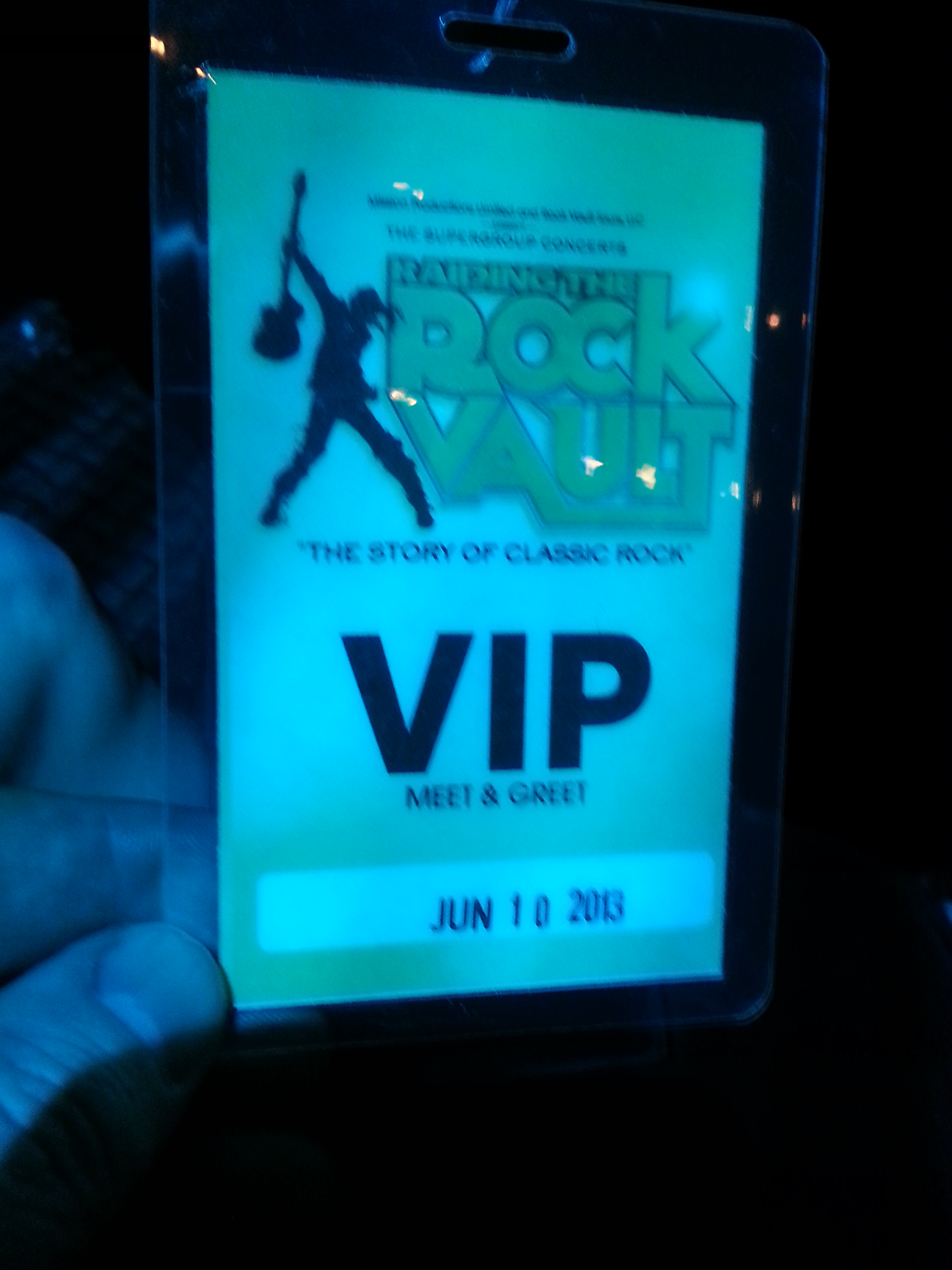 RAIDING THE ROCK VAULT!!! We got early admittance to the venue and were ushered into the green room to meet the guys from the show. Tracii Guns, John Payne, Paul Shortino, Andrew Freeman, Robin Mc Auley, Jay Schellen, Michael T. Ross, and Jason Boyleston came in and were very gracious and friendly to us and the other four people that were there. My wife (Dani) and Tracii had a fun discussion: my wife: Hi, I’m Dani.” Tracii: “Ha ha you have a boys name” pause “Ha ha I have a girls name.” Paul Shortino gave me a hug and we took some photos. We chatted for a few then it was off to our seats.